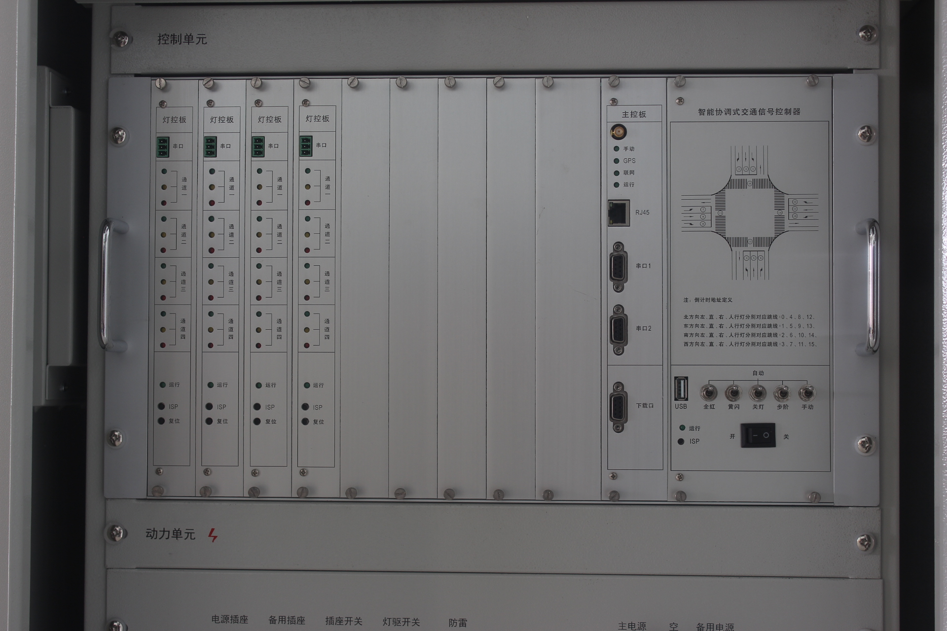 6、最大可配置灯驱控制模块板8块,支持96路灯驱输出,支持32个主相位,实现双路口的集中16相位控制; |